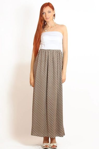 Красивый сарафан в пол! Данная модель интересна тем, что верхняя часть представляет собой белый эластичный топ-бандо на резинке сзади, а нижняя часть - свободная юбка клеш из ткани цвета "кофе с молоком" в белый горошек.